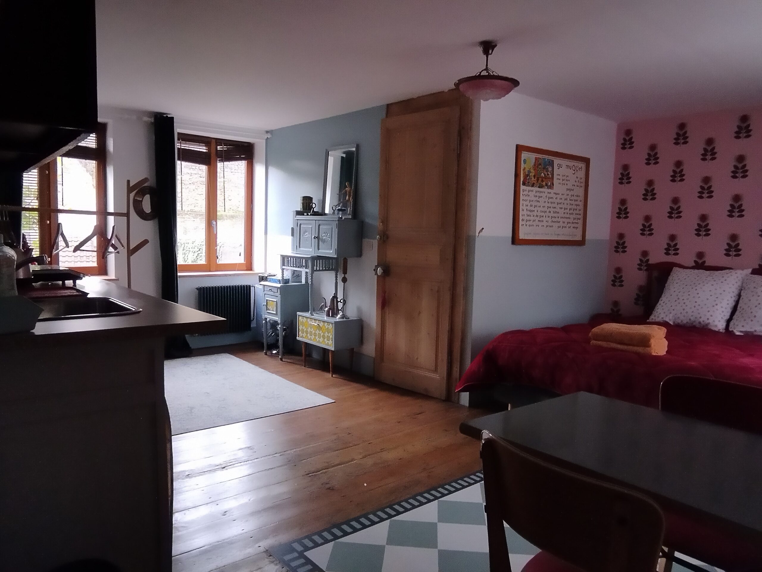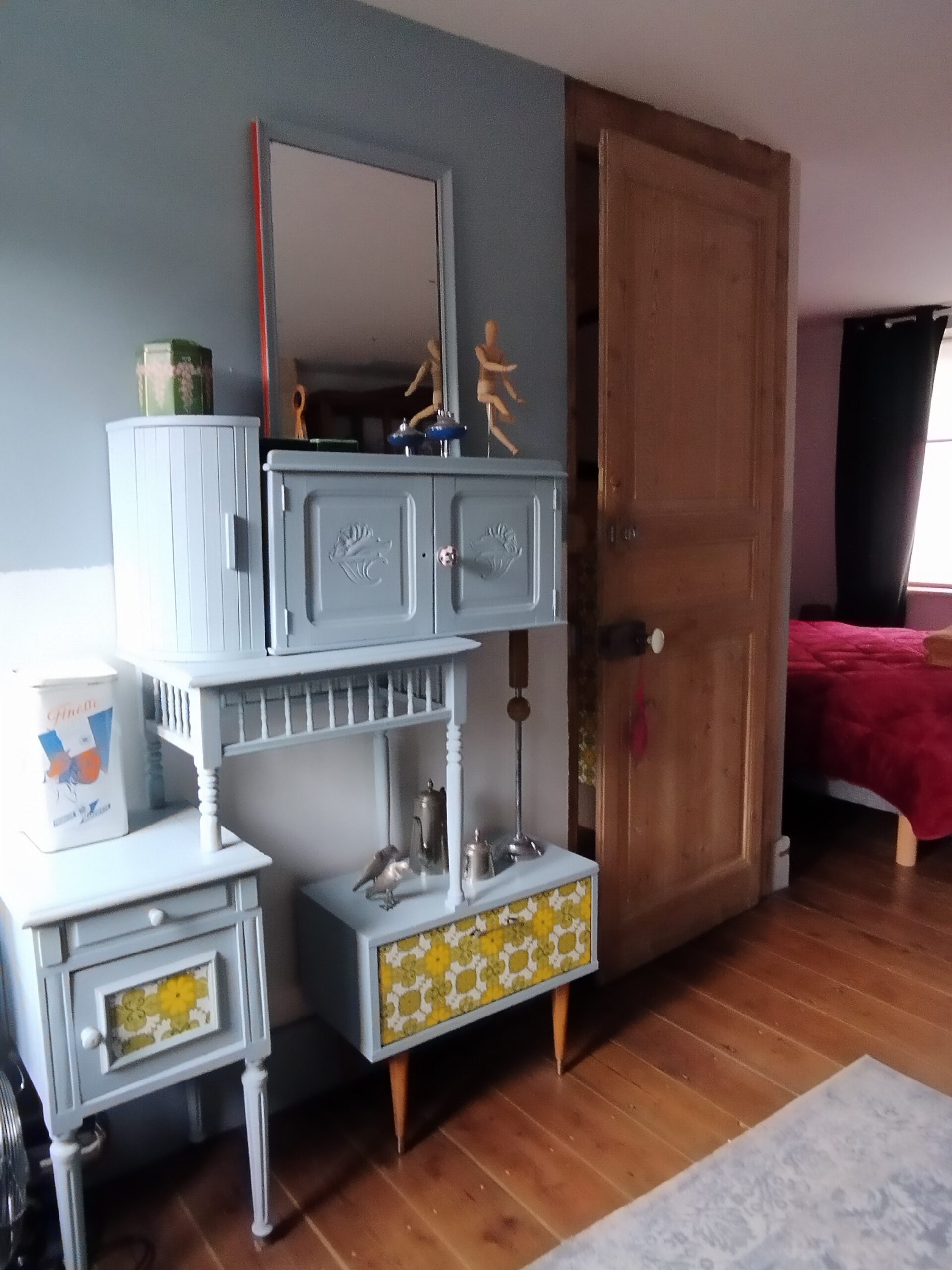 Elle couvre toute la superficie du 1er étage.L’espace nous a permis d’y ajouter une salle de bain et un coin cuisine.La déco quelque peu « vintage » est un curieux mélange d’objets chinés ou détournés.( vous devinez avec quoi est faite la tête de lit…)